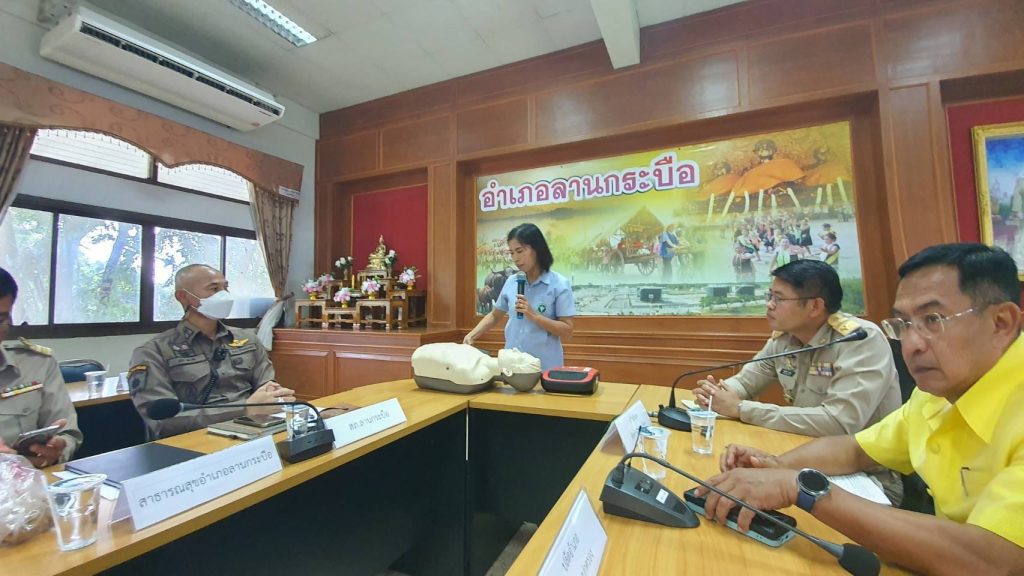 ข่าว กต.ตร.สภ.ลานกระบือ 01/10/2567 โดย admin / ข่าวประชาสัมพันธ์,ข่าวกต.ตร.สภ.ลานกระบือ,ข่าวประชาสัมพันธ์,ผลการปฏิบัติ,งานอำนวยการ,ผลการปฏิบัติ ข่าว กต.ตร.สภ.ลานกระบือ วันที่ 1 ตุลาคม 2567 เวลา 13.30 น. พ.ต.ท.ปรีชา ชนะภัย สวป.สภ.ลานกระบือ เป็นตัวแทนสถานีตำรวจภูธรลานกระบือ ร่วมกับอำเภอลานกระบือ จัดอบรมการใช้เครื่องกระตุกหัวใจไฟฟ้าอัตโนมัติ (AED) และสอนการทำCPR โดยนางสาวพิมพา แออ่วม พยาบาลวิชาชีพชำนาญการพิเศษโรงพยาบาลลานกระบือ ในที่ประชุมคณะกรรมการบริหารงานอำเภอ (กบอ.) โดยนายสมเกียรติ ชื่นอยู่ นายอำเภอลานกระบือ เป็นประธาน เพื่อให้ผู้บริหารในเขคพื้นที่อำเภอลานกระบือมีความรู้ในการใช้เครื่องกระตุกหัวใจไฟฟ้าอัตโนมัติ (AED)และการช่วยชีวิตกรณีฉุกเฉิน ณ ห้องประชุม ชั้น 2 ที่ว่าการอำเภอลานกระบือ FacebookFacebookXXLINELine