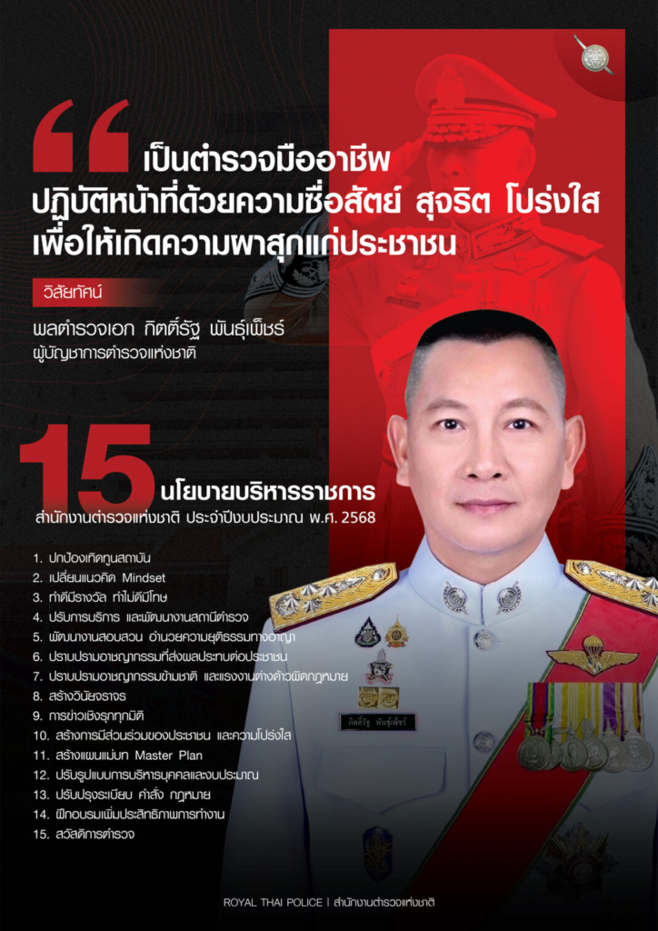1. การสั่งให้ข้าราชการตำรวจไปช่วยราชการ ต้องเป็นไปตามกฎหมายและระเบียบ โดยเฉพาะในสถานีตำรวจที่ต้องให้บริการประชาชน2. สำนักงานตรวจคนเข้าเมือง ต้องไม่ปล่อยปละละเลยให้มีการลักลอบกระทำความผิดเกี่ยวกับแรงงานต่างด้าวหลบหนีเข้าเมือง และประกอบอาชีพโดยผิดกฎหมาย3. การดูแลนักท่องเที่ยว การรักษาความปลอดภัย ดูแลอำนวยความสะดวกนักท่องเที่ยวทั้งชาวไทยและชาวต่างชาติ4. การบริหารจัดการจราจร อำนวยความสะดวกการจราจร ป้องกันและลดอุบัติเหตุในช่วงเทศกาล5. สนับสนุนความร่วมมือในการทำงานของสมาคมแม่บ้านตำรวจร่วมกับสำนักงานตำรวจแห่งชาติ6. ผู้บัญชาการ/ผู้บังคับการ จะต้องเป็น อินฟลูเอนเซอร์ ด้วยตนเอง ให้เป็นที่พึ่งของประชาชนอย่างแท้จริง